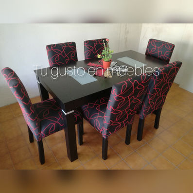 mesa fija de 1.40 cm x 0.80 cm, enchapada en paraiso lustrada con excelente terminación.Con 6 Sillas vestidas tapizadas tela chenille. Fabricadas en madera maciza reforzadas..Con resorte en los asientos. Tapizados trabajados con placa soft de alta densidad.