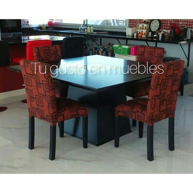 MESA CUADRADA LAQUEADA CON BASE CENTRAL CON SILLAS VESTIDAS EN CHENILLE